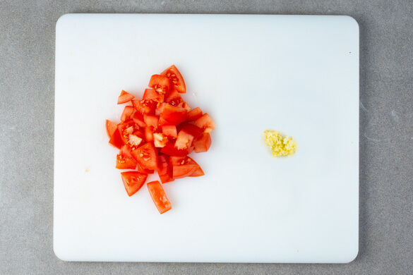 Die Tomate vierteln und in ca. 2cm große Würfel schneiden. Den Knoblauch schälen und fein würfeln. Die Tomaten und die 1/2 des Knoblauchs in einem kleinen Topf mit 1EL Olivenöl bei starker Hitze ca. 2Min. anbraten. Mit 1 Prise Salz würzen und die Tomaten mit einer Gabel leicht zerdrücken. Mit 450ml Wasser ablöschen, die 1/2 des Brühgewürzes einrühren und zum Kochen bringen.