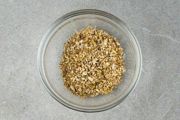 Den restlichen Knoblauch in derselben Pfanne mit 1EL Olivenöl ca. 1Min. anbraten und auf einem Teller beiseitestellen, das Öl in der Pfanne lassen. Die Sonnenblumenkerne grob hacken, mit der Za’atar-Gewürzmischung, 2TL Zitronenschale, dem Knoblauch und 1 Prise Salz vermengen und über die Guacamole streuen.