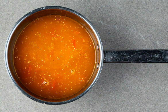 Die Quinoa in einem feinmaschigen Sieb mit warmem Wasser abspülen, in die kochende Tomatenbrühe geben und 10–12Min. abgedeckt bei niedriger bis mittlerer Hitze sanft köcheln lassen. Vom Herd nehmen und bis zum Servieren warm halten.