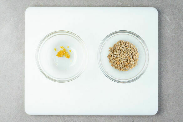 Die Zitronenschale abreiben und die Zitrone halbieren, eine Hälfte auspressen, die andere Hälfte in Spalten schneiden. Die Sonnenblumenkerne in einer großen Pfanne ohne Zugabe von Fett bei mittlerer Hitze 1–2Min. goldbraun anrösten. Vorsicht, sie können schnell dunkel werden! Zum Abkühlen aus der Pfanne nehmen und beiseitestellen, die Pfanne aufbewahren.
