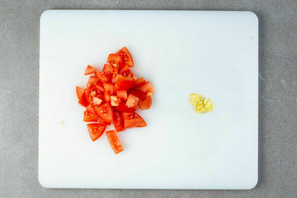 Die Tomaten vierteln und in ca. 2cm große Würfel schneiden. Den Knoblauch schälen und fein würfeln. Die Tomaten und die 1/2 des Knoblauchs in einem mittelgroßen Topf mit 1EL Olivenöl bei starker Hitze ca. 2Min. anbraten. Mit 1 Prise Salz würzen und die Tomaten mit einer Gabel leicht zerdrücken. Mit 850ml Wasser ablöschen, das Brühgewürz einrühren und zum Kochen bringen.