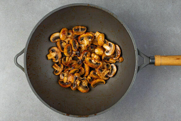Den Knoblauch, 2EL Sojasauce und die Sriracha-Sauce in derselben Pfanne mit 1EL Pflanzenöl bei mittlerer bis starker Hitze einige Sekunden erwärmen, dann die Pilze dazugeben und 4–5Min. braten. Die Pilze aus der Pfanne nehmen, sobald sie appetitlich gebräunt und weich sind.