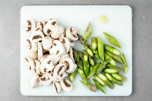 Die holzigen Enden des Spargels abschneiden, dann die Stangen schräg in 3–4cm große Stücke schneiden. Die Pilze ggf. säubern und in ca. 0,5cm dicke Scheiben schneiden. Den Knoblauch schälen und sehr fein würfeln oder durch eine Knoblauchpresse drücken. In einem mittelgroßen Topf ausreichend gesalzenes Wasser für die Nudeln zum Kochen bringen.