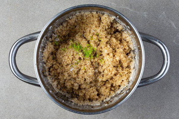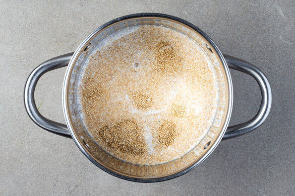 In einem kleinen Topf die Kokosmilch mit 250ml Wasser und 1 kräftigen Prise Salz zum Kochen bringen. Die Quinoa in einem feinmaschigen Sieb mit warmem Wasser abspülen, in die kochende Flüssigkeit geben und 10–12Min. abgedeckt bei niedriger bis mittlerer Hitze sanft köcheln lassen. Vom Herd nehmen und bis zum Servieren warm halten.