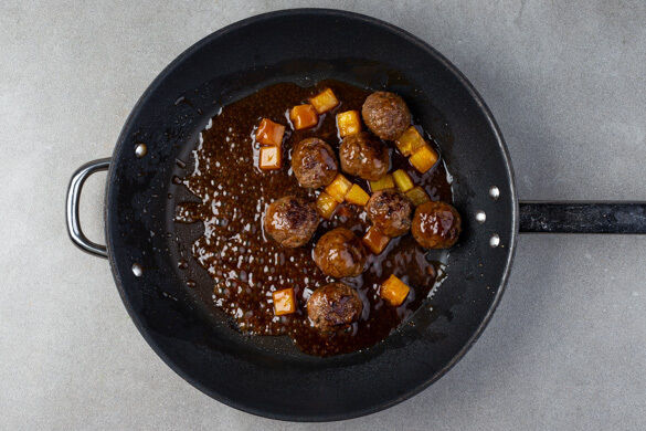 Die Hackbällchen in einer großen Pfanne mit 1EL Pflanzenöl bei starker Hitze 4–5Min. rundum anbraten. Die Ananas-Soja-Sauce untermengen, bei mittlerer Hitze einmal aufkochen und 3–4Min. köcheln lassen, bis die Sauce leicht eingedickt ist und die Hackbällchen gar sind.