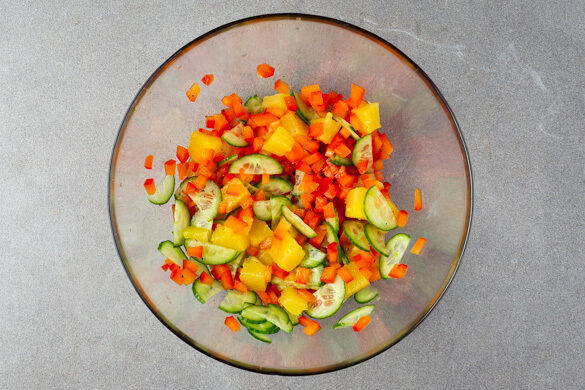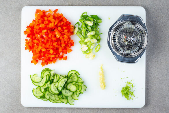 Die Tomaten in kleine Würfel schneiden. Die Gurke längs halbieren und in dünne Scheiben schneiden. Die Lauchzwiebel schräg in dünne Ringe schneiden. Den Knoblauch schälen und sehr fein würfeln oder durch eine Knoblauchpresse drücken. Die Limettenschale abreiben, dann die Limette halbieren und auspressen.