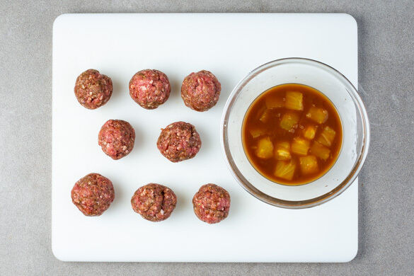 Das Hackfleisch mit 1EL Sojasauce, dem Knoblauch, der Gewürzmischung, 2 Prisen Salz und 1 Prise Pfeffer verkneten und zu ca. 8 Bällchen formen. 1–2TL Speisestärke mit 3EL Wasser glatt rühren, dann die restliche Sojasauce, die restliche Ananas und den restlichen Ananassaft untermengen.