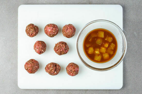 Die Hackbällchen in einer großen Pfanne mit 1EL Pflanzenöl bei starker Hitze 4–5Min. rundum anbraten. Die Ananas-Soja-Sauce untermengen, bei mittlerer Hitze einmal aufkochen und 3–4Min. köcheln lassen, bis die Sauce leicht eingedickt ist und die Hackbällchen gar sind.