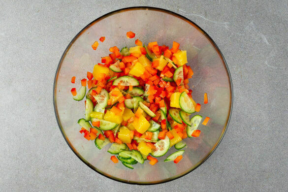 Die Tomaten vierteln in kleine Würfel schneiden. Die Gurke längs halbieren und in dünne Scheiben schneiden. Die Lauchzwiebeln schräg in dünne Ringe schneiden. Den Knoblauch schälen und sehr fein würfeln oder durch eine Knoblauchpresse drücken. Von beiden Limetten die Schale abreiben, dann die Limetten halbieren und auspressen.