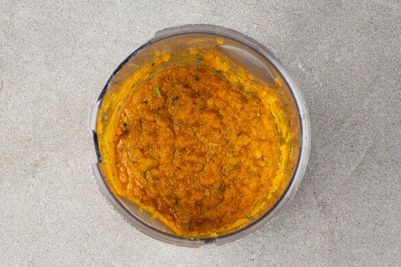 Die Zwiebel schälen, halbieren und grob würfeln. Den Ingwer schälen und ebenfalls grob würfeln. Die Korianderblätter abzupfen und die Stängel aufbewahren. Die Zwiebeln, den Ingwer, die Korianderstängel, die 1/2 des Paprikapulvers, 1/2–1TL Kurkuma, 4EL Wasser und 1 Prise Salz in einem hohen Gefäß mit einem Stabmixer zu einer glatten Würzpaste pürieren.