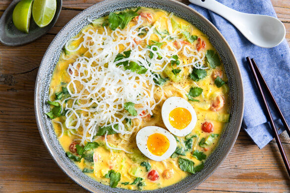 Heute gibt’s mal wieder etwas ganz Frivoles für die Feinschmecker unter euch: ein traumhaft cremiges Süppchen südostasiatischer Herkunft, das mit Glasnudeln, Gemüse und Ei auch Nicht-Foodies am Tisch überzeugen wird! Der Clou ist aber die selbst gemachte Basis der Suppe, die dank frischem Ingwer, Koriander und Kurkuma, Zwiebel, Kokosmilch und Kichererbsenmehl nicht nur gesund, sondern auch unglaublich lecker ist!