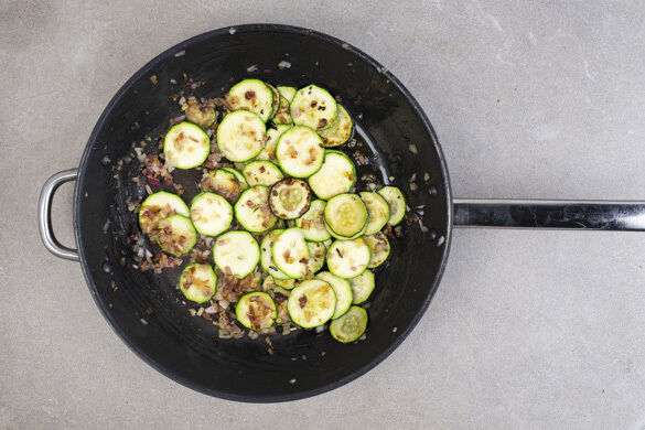 Die Zucchini in einer großen Pfanne mit 2EL Olivenöl bei starker Hitze 4–6Min. anbraten. Die Zwiebeln dazugeben und 1–2Min. mitbraten, bis das Gemüse leicht goldbraun ist.
