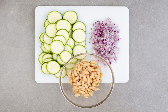 Den Backofen auf 200°C (180°C Umluft) vorheizen. Die Zucchini in dünne Scheiben schneiden. Die Zwiebeln schälen, halbieren und fein würfeln. Die Bohnen in einem Sieb mit kaltem Wasser abspülen und abtropfen lassen.