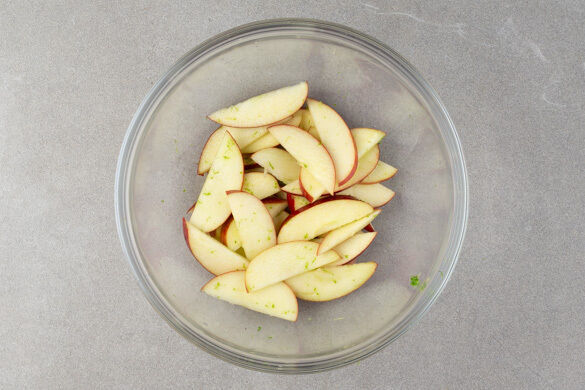 Die Limettenschale abreiben, dann die Limetten halbieren und auspressen. Die Äpfel vierteln, entkernen und in dünne Scheiben schneiden. Die Apfelscheiben mit dem Limettensaft und der -schale vermengen.