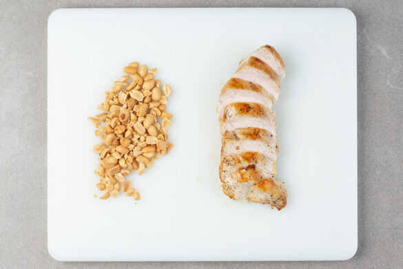 Das Fleisch leicht schräg in 1–2cm dicke Tranchen schneiden. Die Erdnüsse grob hacken. Den fertig gegarten Reis mit Reisessig, Salz und Zucker nach Geschmack verfeinern. Den Salat nach Wunsch mit (hellem) Essig abschmecken und auf dem Reis anrichten. Mit dem Hähnchen belegen und mit den Erdnüssen und dem Koriander garniert servieren.