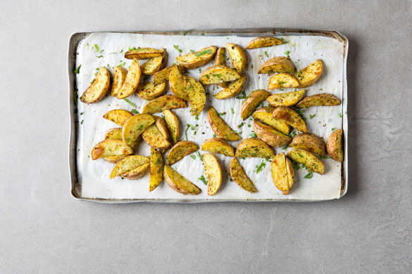 Inzwischen die Kartoffeln samt Schale in 1–2cm breite Spalten schneiden und auf einem mit Backpapier ausgelegten Backblech mit 1–2EL Olivenöl sowie der Gewürzmischung nach Geschmack vermengen. Gleichmäßig verteilen und im Ofen 20–25Min. backen, bis die Kartoffeln knusprig sind.