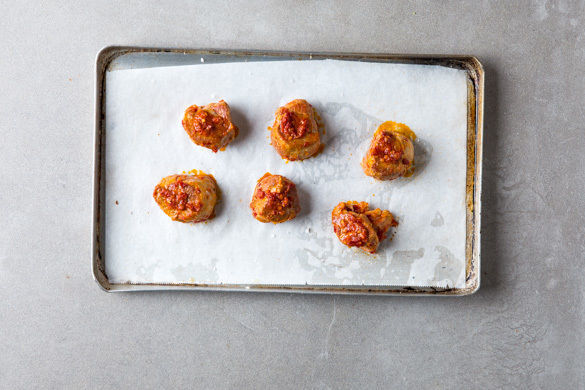 Das Fleisch mit etwas Küchenkrepp trocken tupfen und in 6–8 gleich große Stücke schneiden. Mit Salz würzen und in einer großen Pfanne mit 1–2EL Olivenöl bei mittlerer bis starker Hitze auf jeder Seite 1–2Min. goldbraun anbraten. Vom Herd nehmen und je nach Schärfewunsch mit Sambal Oelek bestreichen. Zu den Kartoffeln aufs Blech geben und 5–7Min. im Ofen mitgaren.