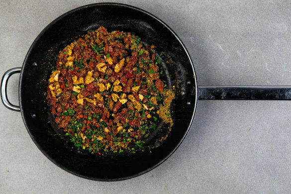Das Panko-Paniermehl, die getrockneten Tomaten, die Walnüsse, die Petersilie, den Knoblauch und die Chilischote nach Geschmack in einer mittelgroßen Pfanne mit 1–2EL Olivenöl sowie Salz und Pfeffer bei starker Hitze 3–5Min. goldbraun anrösten.