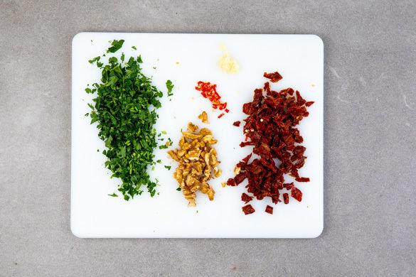 Die getrockneten Tomaten fein würfeln. Die Walnüsse grob hacken. Die Petersilie samt Stängeln fein hacken. Den Knoblauch schälen und durch eine Knoblauchpresse drücken oder sehr fein würfeln. Die Chilischote längs halbieren und in hauchdünne Streifen schneiden. Tipp: Für weniger Schärfe die Kerne entfernen oder die Chilischote erst am Ende zum Garnieren nutzen.