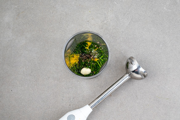 Den Dill, die Zitronenschale und den Knoblauch mit 2EL Olivenöl und 1–2EL Wasser in einem hohen Gefäß mit einem Stabmixer fein pürieren. Das Pesto mit Salz und Pfeffer abschmecken.
