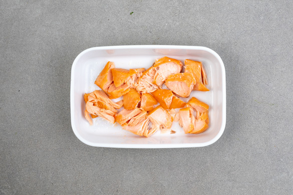 Den Fisch mit einer Gabel grob zerteilen, dabei die Haut entfernen. Ggf. vorhandene Gräten mit einer Pinzette entfernen oder später beim Essen darauf achten. Den Fisch in eine kleine Auflaufform geben, etwas Pastawasser darüberträufeln und im Ofen bis zum Servieren erwärmen.
