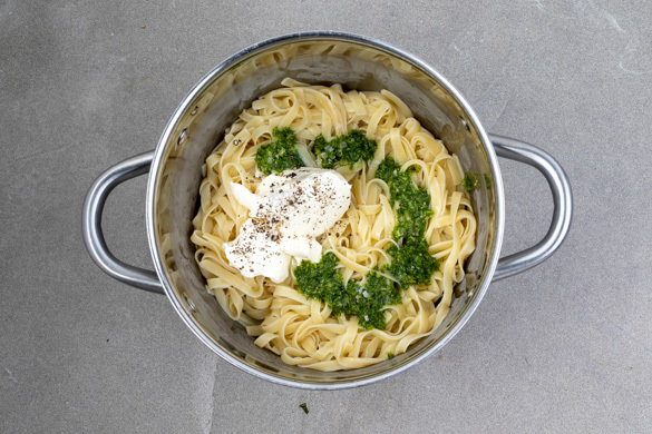 Das Pesto, die 1/2 der Crème fraîche und 2–3EL Pastawasser zur abgetropften Pasta in den Topf geben und alles gut verrühren, ggf. mehr Pastawasser verwenden. Bei niedriger Hitze 2–3Min. erwärmen und mit Zitronensaft, Salz und Pfeffer abschmecken.