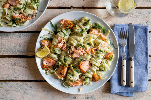 Ein feiner Fisch adelt noch jedes schnelle Pastagericht – so ist es auch hier und heute, wo saftig-zarter Stremellachs beste italienische Tagliatelle in einer köstlichen Sauce aus Crème fraîche und einem zitronigen Dill-Pesto begleitet. Ein Fest für die Augen und die Geschmacksknospen gleichermaßen!