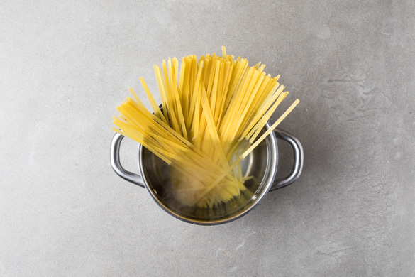 Die Pasta in das kochende Wasser geben und in 7–9Min. bissfest kochen. In ein Sieb abgießen und abtropfen lassen, dabei ca. 1 Tasse Pastawasser auffangen. Die abgetropfte Pasta wieder zurück in den Topf geben und abgedeckt warm halten.