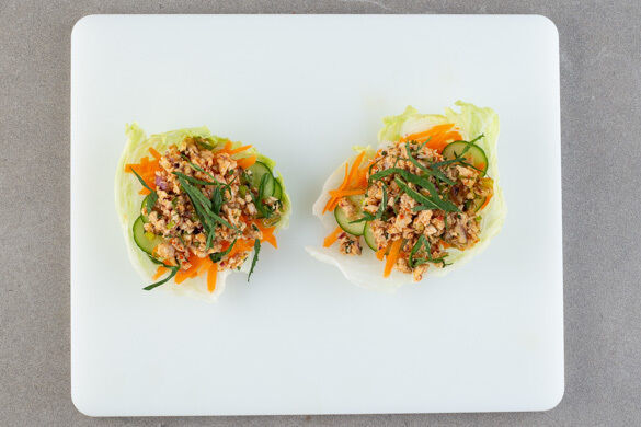 Das Fleisch ggf. mit Salz, mehr Chiliflocken und mehr Limettensaft abschmecken. Die einzelnen Salatblätter mit einigen Glasnudeln, Gurkenscheiben, Karotten und der Hähnchenmischung füllen, mit Minze garnieren und servieren. Tipp: Wer mag, kann auch einfach alle Zutaten auf dem Tisch bereitstellen und jeden selbst füllen lassen.