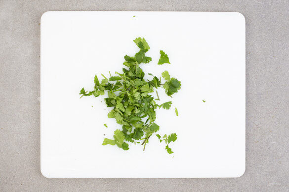 Den Koriander samt Stängeln grob schneiden. Die Pizza in Stücke schneiden und mit dem Koriander garniert servieren.