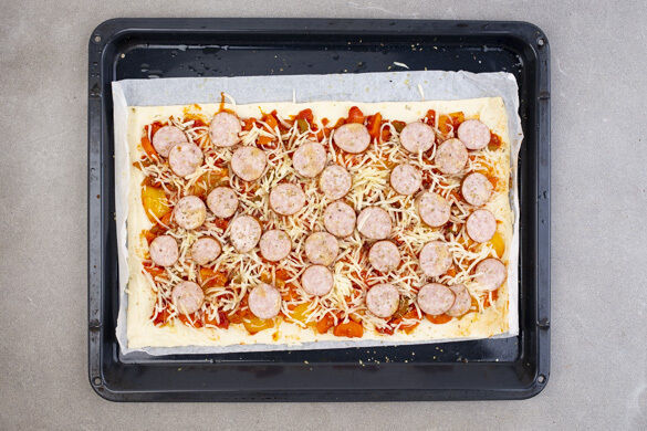 Den Teig mit dem Papier nach unten auf einem Backblech ausrollen und die Gemüsesauce gleichmäßig darauf verteilen. Den Käse darüberstreuen und mit der Rauchwurst belegen. Die 1/2 des Oreganos über die Pizza streuen und 1TL Olivenöl darüberträufeln. Die Pizza im Ofen 15–20Min. knusprig backen.