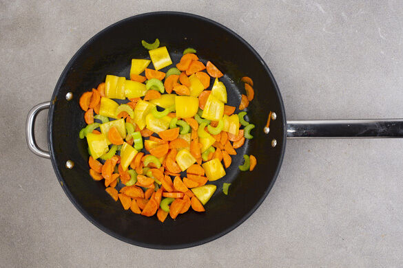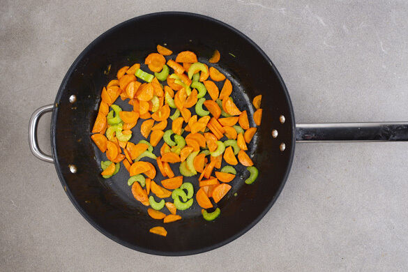Den Backofen auf 240°C (220°C Umluft) vorheizen. Die Karotte ggf. schälen, längs halbieren und in dünne Scheiben schneiden. Den Sellerie ebenfalls dünne Scheiben schneiden. Die Karotten und den Sellerie in einer großen Pfanne mit 1EL Olivenöl bei mittlerer bis starker Hitze 5–6Min. braten, bis das Gemüse weich ist.