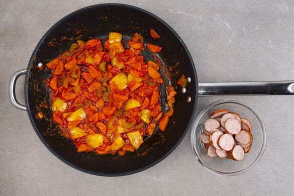 Die 1/2 der gehackten Tomaten dazugeben und zum Kochen bringen. Die übrigen Tomaten werden für dieses Rezept nicht benötigt. 2–3Min. sanft köcheln lassen, bis der Großteil der Flüssigkeit verdampft und die Gemüsesauce eingedickt ist. Vom Herd nehmen und mit Salz, Pfeffer und ggf. mehr Paprikapulver abschmecken. Die Rauchwurst in ca. 0,5cm dicke Scheiben schneiden.