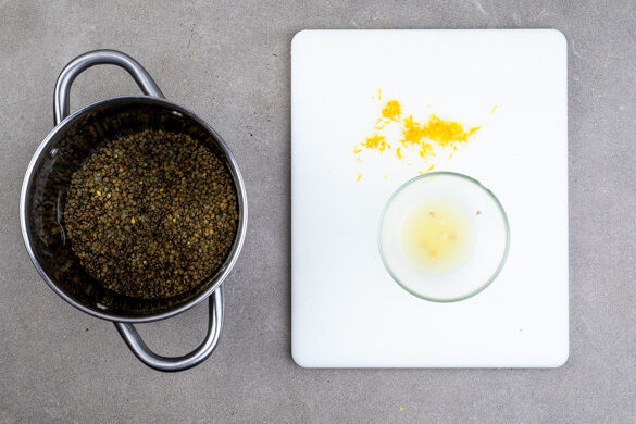 Die Zitronenschale abreiben, dann die Zitrone halbieren und auspressen. Die Linsen in einem Sieb abtropfen lassen und in einen mittelgroßen Topf geben.