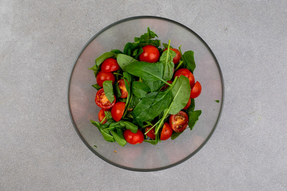 Die Kirschtomaten halbieren und mit 1EL Olivenöl sowie Salz und Pfeffer vermengen. Den Spinat nach Wunsch grob schneiden und mit dem Dressing unter die Tomaten mischen.