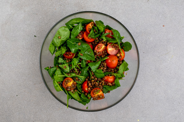 Die Linsen mit dem Spinat-Tomaten-Salat vermengen und mit Salz und Pfeffer abschmecken. Den Feta mit dem Linsensalat anrichten und servieren.