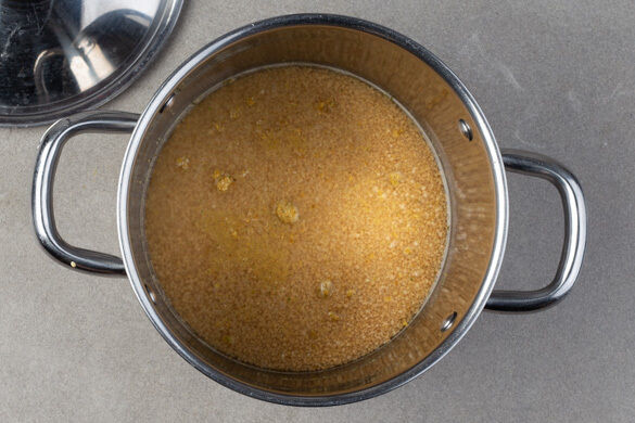 In einem kleinen Topf 200ml Wasser mit der 1/2 des Brühgewürzes zum Kochen bringen. Den Topf vom Herd nehmen, die 1/2 des Couscous in das kochende Wasser rühren und abgedeckt 8–10Min. quellen lassen.