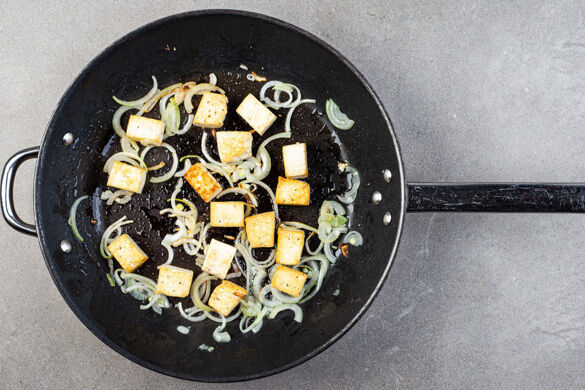 Den Tofu und die Zwiebeln in einer mittelgroßen Pfanne mit 1EL Olivenöl bei mittlerer Hitze ca. 5Min. unter gelegentlichem Rühren braten, bis der Tofu rundum appetitlich gebräunt ist und die Zwiebeln weich sind.