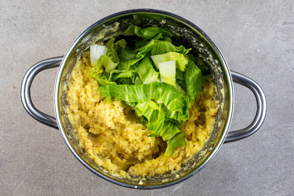 Die Kartoffeln in das kochende Wasser geben und in 12–15Min. bissfest kochen. Mit einem Messbecher ca. 100ml Kochwasser abschöpfen, dann die Kartoffeln in einem Sieb abtropfen lassen und zurück in den Topf geben.