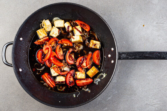 Den Knoblauch und 1TL Mehl unterrühren und ca. 1Min. mitbraten, dann die Tomaten, das Ketjap Manis, die BBQ-Sauce, 2 Prisen Salz und 100ml Wasser dazugeben und 5–6Min. köcheln lassen, bis die Tomaten gar sind und eine dickflüssige Sauce entstanden ist. Die Pfanne vom Herd nehmen.