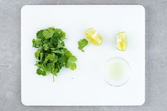 Die Korianderblätter abzupfen und grob schneiden. 1 Limette halbieren und auspressen, die übrige Limette in Spalten schneiden.