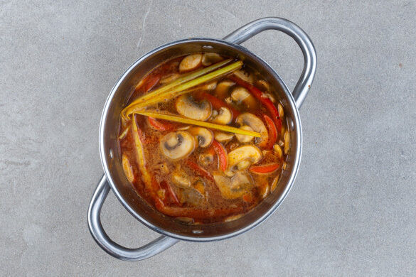 Das kochende Wasser angießen, dann 1EL Fischsauce, das Brühgewürz, das Zitronengras und 1/2TL Zucker unterrühren. Die Suppe einmal aufkochen und anschließend ca. 3Min. bei mittlerer Hitze sieden lassen.
