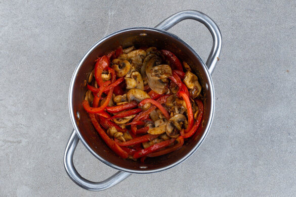 In einem Wasserkocher 600ml Wasser aufkochen. Die Pilze, die Paprika und den Ingwer in einem mittelgroßen Topf mit 1EL Pflanzenöl und 1 Prise Salz bei mittlerer Hitze ca. 4Min. anbraten. Das Sambal Oelek hinzugeben und 1Min. mitrösten.