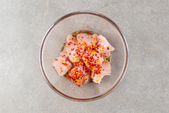 Den Backofen auf 200°C (180°C Umluft) vorheizen. 1/2TL Chiliflocken, 1EL Pflanzenöl, 1TL Essig und 1 kräftige Prise Salz verrühren. Das Fleisch trocken tupfen und mit der Würzsauce vermengen.