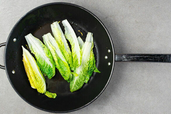 Den Salat in einer großen Pfanne mit 2EL Pflanzenöl bei starker Hitze 2–3Min. anbraten, bis der Rand jeweils leicht gebräunt, das Innere aber noch knackig ist. Zwischendurch mehrmals wenden. Den Salat mit 2 kräftigen Prisen Salz würzen, dann aus der Pfanne nehmen und auf einem Teller beiseitestellen.