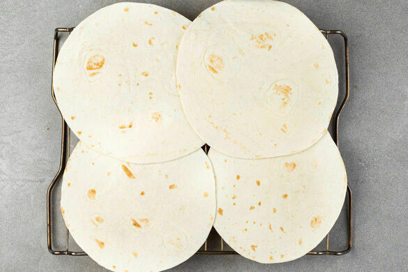 Die Tortillas auf zwei Backrosten 2–3Min. im Ofen erwärmen.