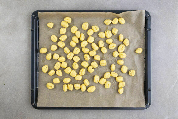 Die Gnocchi auf einem mit Backpapier ausgelegten Backblech verteilen und mit 2–3EL Olivenöl und 1/2TL Salz vermengen. 8–10Min. im Ofen backen, bis die Gnocchi goldbraun und knusprig sind.