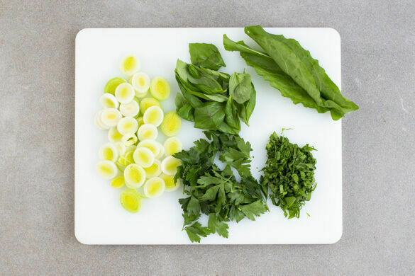 Den Backofen auf 240°C (220°C Umluft) vorheizen. Den Lauch in dünne Ringe schneiden. Die 1/2 des Sauerampfers sowie die Petersilie und das Basilikum samt Stängeln grob schneiden.