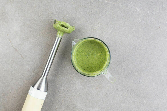 Die Sauce in einem hohen Gefäß mit einem Stabmixer glatt pürieren. Mit Salz und Pfeffer abschmecken.