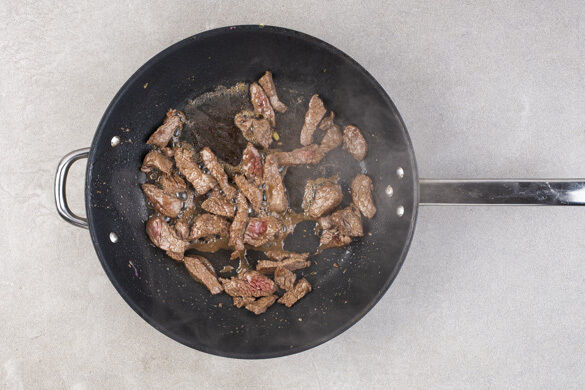 Das Fleisch trocken tupfen, dann in derselben Pfanne mit 1EL Pflanzenöl bei starker Hitze 30Sek.–1Min. rundum goldbraun anbraten.